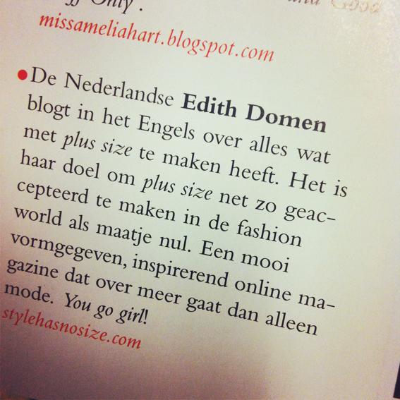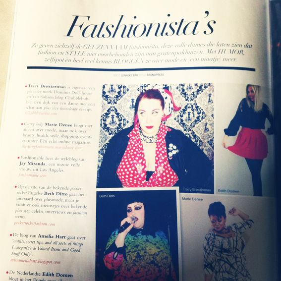 Edith Dohmen and stylehasnosize.com mentioned in Jackie Magazine curved issue. On the same page as The Curvy Fashionista, Beth Ditto and designer of Domino Dollhouse. They call these women: FATshionista’s.. Very happy to be in the high end fashion magazine! They are very positive about the blog: ‘a great designed and inspiring online magazine which is more than fashion only. You go girl!’