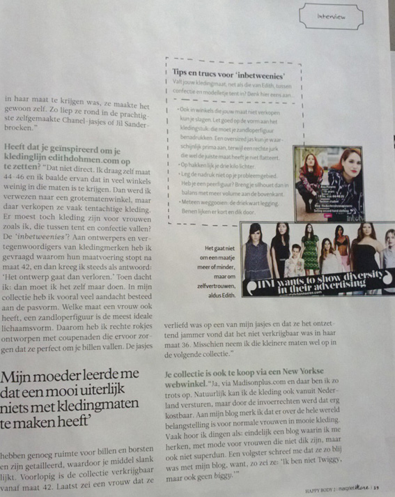 Interview with Edith Dohmen in magazine Margriet More, last week. About her biography, mission and the clothing line. The headline: ‘Good style has no size’. Edith explains that this blog is not just about fashion but also about self esteem. Also she gave some tips and tricks for the in between size and average sized women.