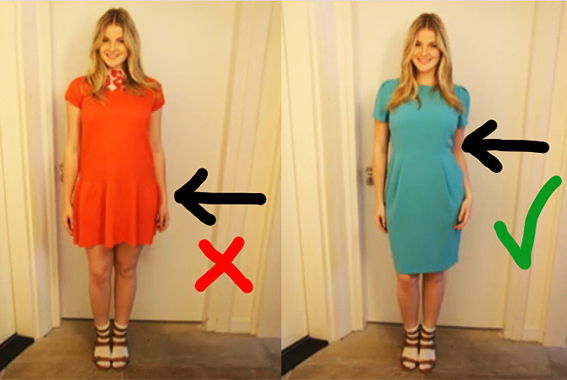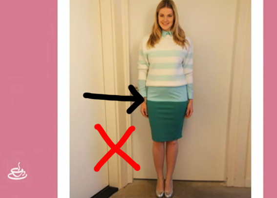 Another tip, I see a lot of women pulling their shirt over their butt or hips to ‘cover’ them. But the opposite happens. You create bigger hips and all the attention will go to this ‘dangerous zone’.