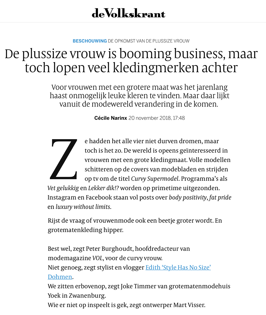 Dohmens grootste wens: dat aparte plusmerken verdwijnen en modemerken alles gewoon doortrekken, van 32 tot 50. Zodat ze gewoon samen met een vriendin met maat 36 kan shoppen. Dat ze mee mag doen, gezien wordt. ‘Dom dat grote labels dat niet snappen’, zegt ze, ‘er zijn veel vollere vrouwen die echt wat te besteden hebben.’ ”